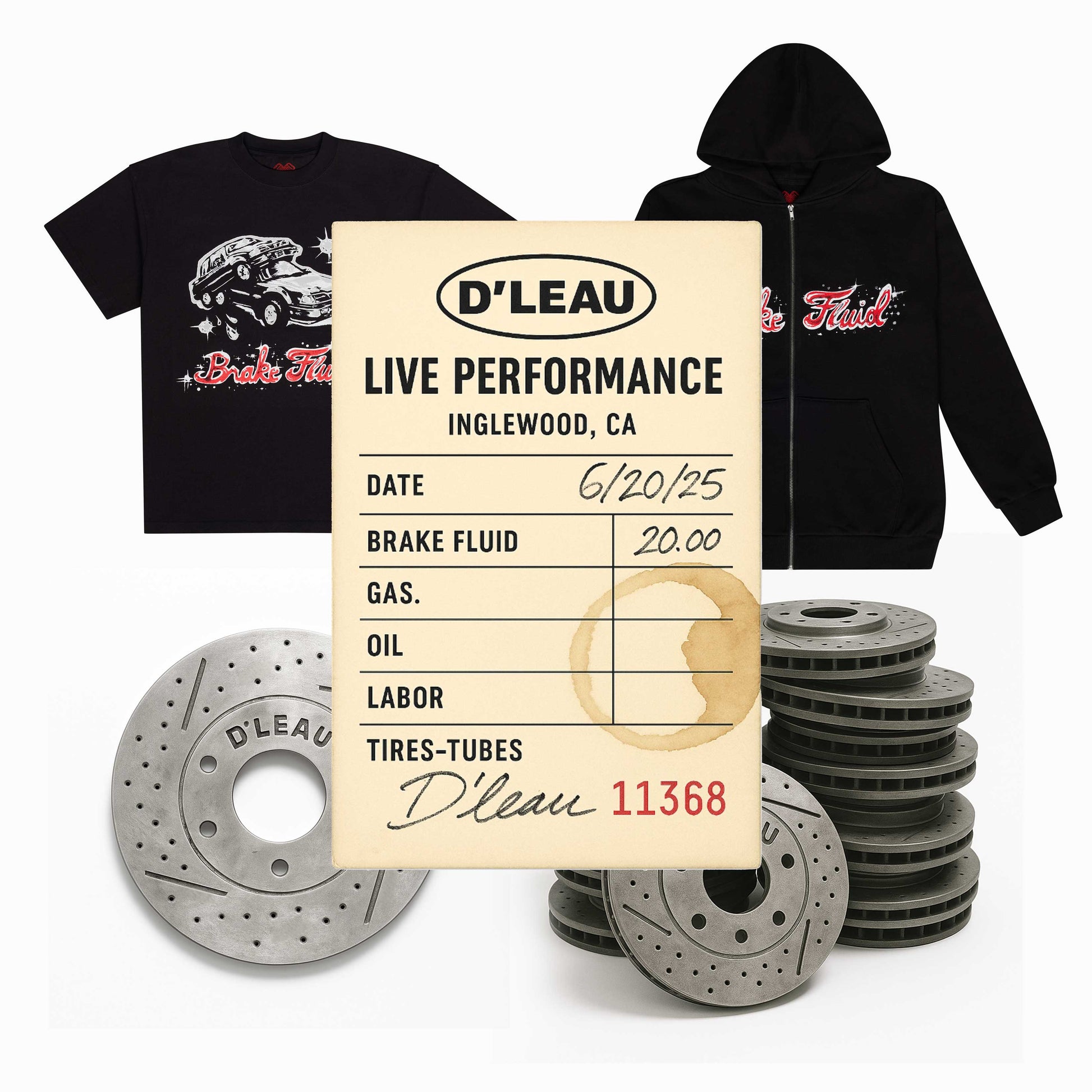 Get the ultimate experience with the BRAKE FLUID ULTRA PACK. This pack includes Brake Fluid Single, DJ Pack, T-Shirt, Hoodie, and a ticket to D'LEAU's LA show. Elevate your music game and style all in one.