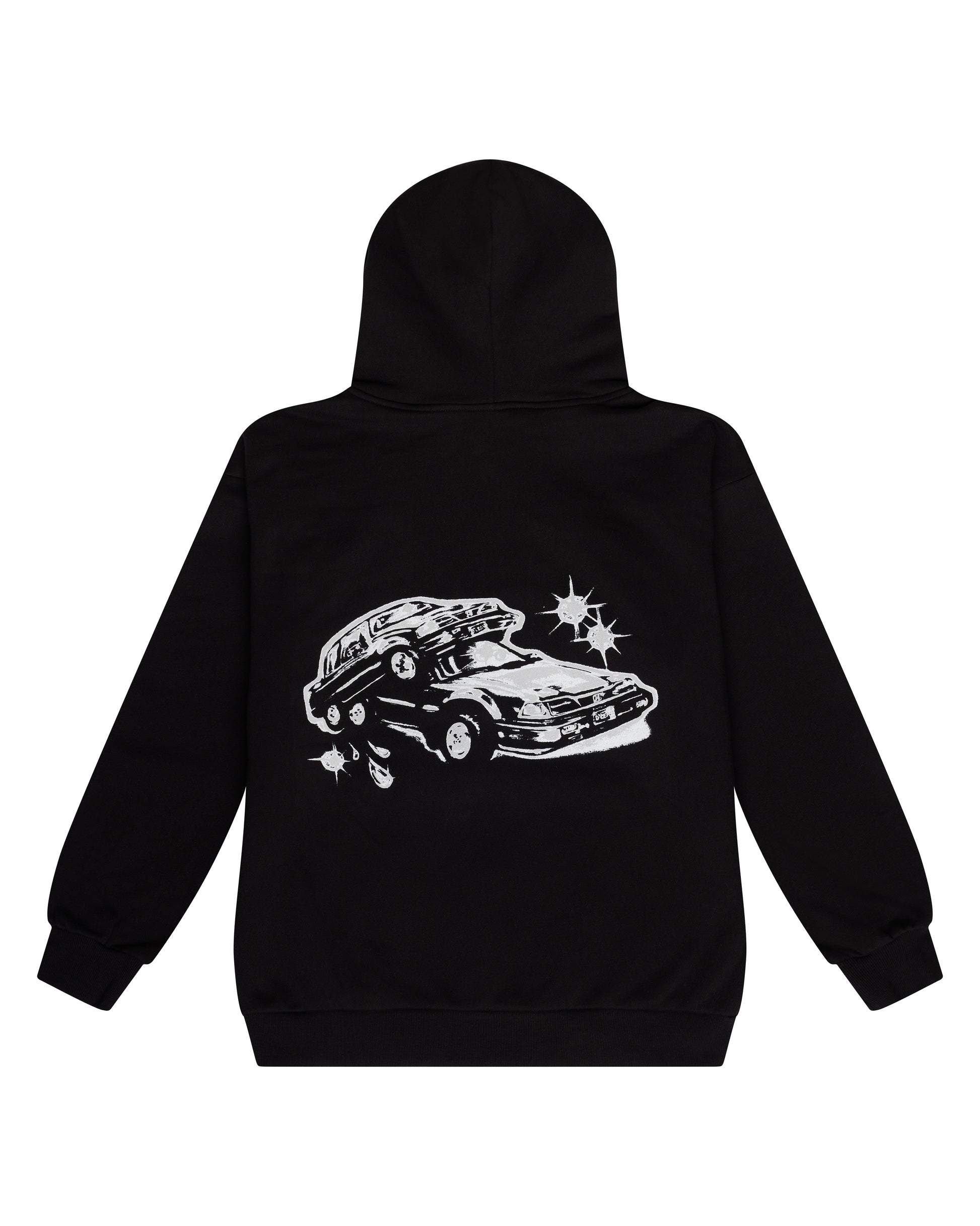 Get ready to hit the streets in style with our black zip up hoodie! Featuring a bold design of two cars in action, inspired by the Brake Fluid album from artist D'LEAU. Stay warm, comfortable, and fashionable in this must-have piece of merch.